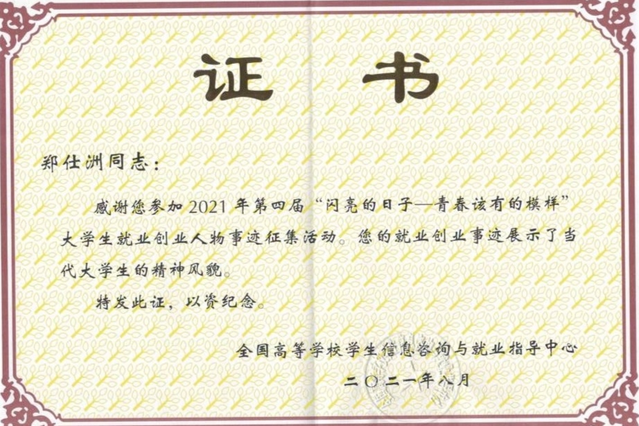 毕业生郑仕洲基层就业事迹《一路向西 扎根边疆——让有限的生命绽放出无限的光芒》入选2021年第四届“闪亮的日子——青春该有的模样”大学生就业创业人物事迹展。
