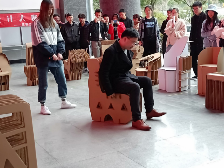 于3月21日下午,在工科楼楼下举办了废弃纸板创意坐具设计大赛的评比与展示活动。