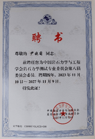 中国岩石力学与工程学会岩石力学测试专委会委员聘书