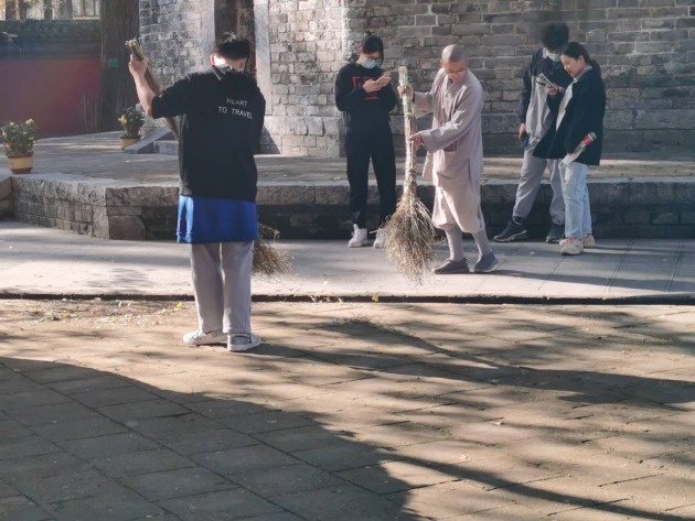 下午1点55分,所有志愿者在图书馆门前集合拍照,出示假条后列队前往广德寺。虽是秋风有些萧瑟但阳光依然和煦,志愿者们先是对广德寺外围进行了清理,随后佩戴好口罩进入寺中。活动过程中,志愿者们认真清理地面上的垃圾、杂物等,并装进随身所带的垃圾袋中。正是落叶纷飞的季节,志愿者主动帮助僧人进行落叶的清扫整理,让寺庙变得更加干净整洁。至此,活动圆满结束。