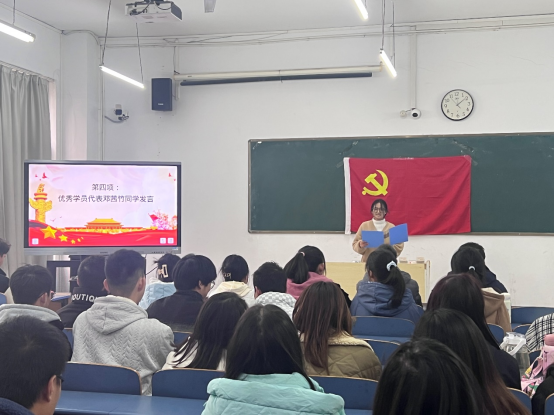 活动开始全体起立奏唱国歌《义勇军进行曲》,全体成员声音洪亮、精神饱满,接着由冷翔老师宣读第三十期入党积极分子培训班结业名单和优秀表彰的决定,并由弋兵书记给优秀学员、优秀组织者及优秀小组颁奖。下一项为优秀毕业学生代表邓茜竹发言,她表示自己今后将不断加强政治理论学习,提高思想道德修养,争取早日成为一名光荣的共产党员。最后一项是弋兵书记作结业总结讲话并宣布培训班正式结业,他首先对同学们顺利完成党课及考试表示祝贺,希望同学们能将所学知识应用到今后的学习、生活和工作中,用理论指导实践,在实践中升华认识,不断开拓创新,积极进取。