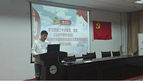 本次党日活动围绕七项内容展开。第一项,全体起立,奏唱国歌《义勇军进行曲》;第二项,全体学生党员重温入党誓词;第三项,由张金域同志带领大家学习并诵读《中国共产党章程》,增强对党的认识,加深政治信仰;第四项,由张向东同志分享学习二十大报告、《习近平著作选读》和《习近平新时代中国特色社会主义思想专题摘编》等学习材料的心得体会:“我们要深刻领悟“两个确立”的决定性意义、坚决做到“两个维护”作为主题教育根本性的政治要求,体现到理论学习、调查研究、推动发展、检视整改各个方面,精心设计教育载体、丰富教育内容形式,在思想上正本清源、固本培元、凝心铸魂,在政治上锤炼品格,不断提高政治判断力、政治领悟力、政治执行力,始终在思想上政治上行动上同以习近平同志为核心的党中央保持高度一致。”;第五项,戴想同志为大家讲党课;第六项,各支部交流发言,杜玉蝶、程冬月、闵轶哲三位同志依次发言;第七项。各支部小组相互讨论,党员们交流讨论自己的学习心得。