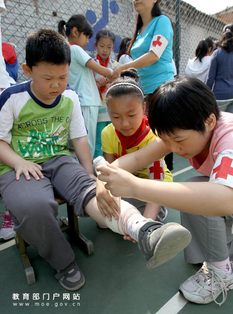 图为红十字小组成员在为“伤员”处理创伤。(中国教育报记者 樊世刚 摄)