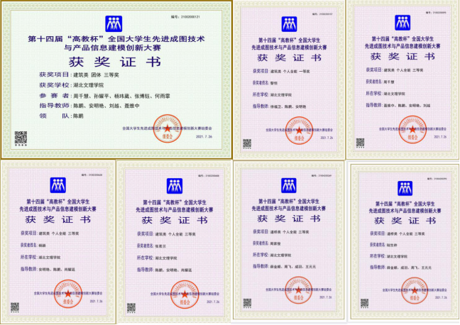 建筑学1911班黎恒在建筑类比赛中获个人全能一等奖,建筑学1811班周千慧﹑建筑学1911班张若兰﹑杨颖分别获得个人全能三等奖,建筑学1811班周千慧﹑孙耀平﹑杨玮葳﹑张博钰﹑何雨霏等五位同学组成的团队获得BIM创新大赛团体三等奖﹑建筑类团体三等奖,道桥1813班周家俊﹑陆生帅两位同学在道桥类比赛中分别获得个人全能三等奖。