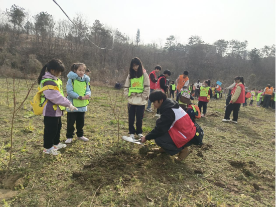 学生干部联合樊城区解放西路社区前往黄家湾自然风景区开展“三月植新苗,携童种春天”植树活动。