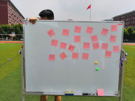 活动开始,各小组按照排好的顺序依次进行比赛,其它小组在赛道外观摩,并为参赛小组呐喊助威,也有小组使出十八般武艺,在不打破坏游戏规则的情况下,对正在参赛的小组进行干扰。场面气氛活跃,参赛人员乐在其中,面露喜色。每个关卡的负责人尽职尽责,为还没有弄清楚游戏玩法的参赛者认真讲解,并且记录好每个小组完成关卡所需要的时间,保证公平公正。当所有关卡都进行完以后,小伙伴们在终点处的“烦恼擦擦无”白板上写下自己近期的烦恼,然后亲手抹去它,正如没有不会结痂的伤口,愿大家的烦恼都散退。