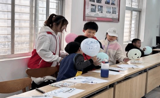 志愿者们紧扣雷锋月“奉献与关怀”精神,精心设计四大互动环节:1.“认识情绪”—故事里的情感启蒙。通过讲述《小云朵的一天》,引导孩子们理解“情绪无好坏,应对有方法”,并结合雷锋助人故事,诠释“帮助他人也能带来快乐情绪”的理念;2.“情绪猜猜乐”—表情中的心灵解码。孩子们争相模仿“喜怒哀乐”表情,通过抢答游戏学习情绪名称,获胜者获得“情绪小博士”贴纸。一名男孩兴奋喊道:“我猜对了‘骄傲’,就像雷锋叔叔戴奖章时的表情!”3.“情绪颜色密码”—画笔下的心灵彩虹。儿童用色彩自由表达情绪:蓝色雨水诉说忧伤,金色太阳描绘喜悦,志愿者借此引导他们用绘画代替哭闹,学会健康宣泄。4.“情绪气球大作战”—释放负面情绪的“爆笑疗法”。随着欢快音乐,孩子们将写有“烦恼”的气球踩爆,高喊“Bye Bye坏情绪!”。气球破裂声与笑声交织,现场化作一片欢乐海洋。