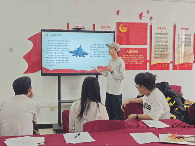 于“筑梦”一站式学生社区开展以“火热军营 精彩人生”为主题国防教育主题会。辅导员潘将军担任主讲人,通过政策解读、国防知识普及、军营故事分享等形式,为学生们带来一堂生动的国防教育课。