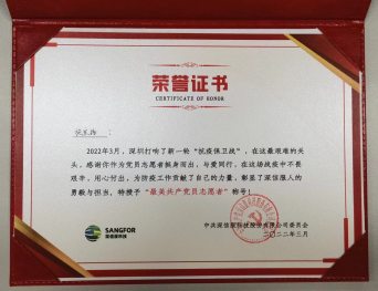 疫情防控期间,施宏扬积极参加社区志愿服务活动。武汉疫情暴发后,刚从省外回家的他迅速向社区申请成为一名志愿者,帮助社区居民送水提菜,凌晨三点钟,还能看到他在楼道晃动的身影。实习期间,在深圳全市居家办公、地铁停运的时候,即使是自己孤身一人来到深圳,他毅然决然再次主动向社区报名,成为一名光荣的志愿者,对社区近一万人的情况挨家排查,并逐个把数据录入系统。他不畏艰险、用心付出,在深圳这场疫情中被特授予“最美共产党员志愿者”荣誉称号。
