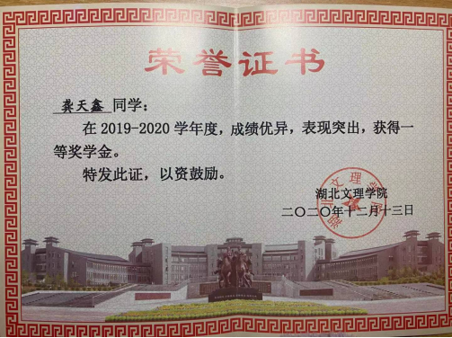 龚天鑫一直认为劳逸结合才能事半功倍。大学五年成绩一直名列前茅,综合素质一直班上前五,多次获得校一等奖学金,创新创业奖学金。在完成这些荣誉的同时也学习了很多软件,比如ps、pr、lumion等软件。她说:“兴趣是学习最好的老师,在付诸行动,一定会收获果实。在专业学习中,课堂上是最有效率的学习方式,还有课前花点时间预习,课后巩固一下,基本都没问题。无论成绩如何,我们应该去反思学习中的收获与不足。因为人生的学习不光是书本知识,还有人的心理,人的意志,各种其它方面的学习。玩也是一种学习,而且在玩的过程中我们能学习到更多书本上没有的知识。正确地规划生活,才能做优秀的人。”